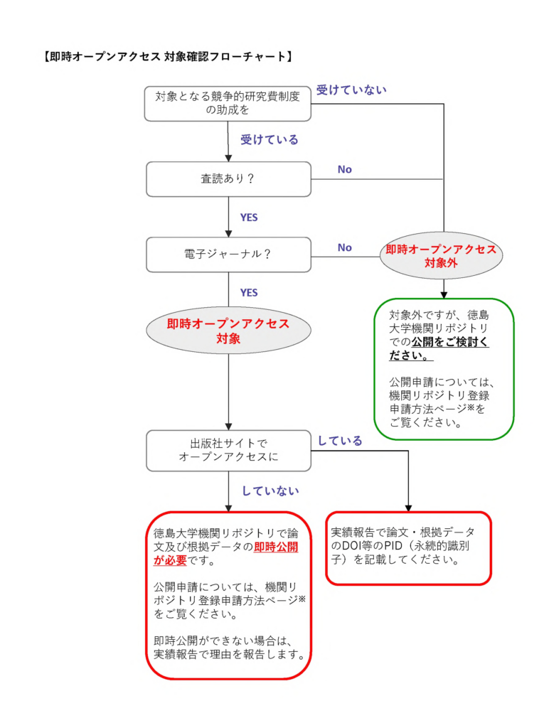 令和6年2月に国の統合イノベーション戦略推進会議で決定された「学術論文等の即時オープンアクセスの実現に向けた基本方針」により、2025年度以降に新たに公募される競争的研究費の採択者は、研究成果である査読済み学術論文及び根拠データを学術雑誌掲載後すぐに誰でも無料で読める形(即時オープンアクセス)で公開することが義務となります。
